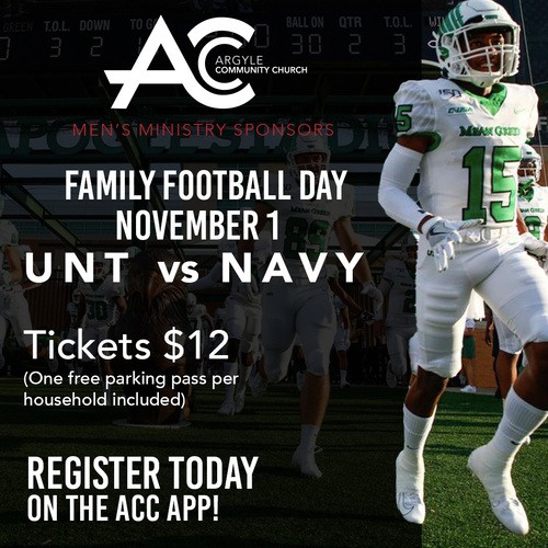 October 25, 2025--Join ACC for an epic matchup at The Mean Green! UNT v. NAVY on November 1st. Game time will be released closer to game day. Parking is included with your ticket purchase (1 parking pass per household).
