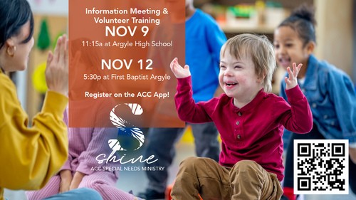 Nov 9 & Nov 12--Do you want to know more about ACC's Special Needs Ministry to see if it's a place that you can use your gifts to help others? Join SHINE leaders for an informational meeting followed by volunteer training on Sunday, November 9 or Wednesday, November 12.