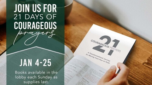 January4 -- 21 Days of Courageous Prayers kicks off Sunday, January 3, 2026 at ACC. Each year, we focus our hearts and minds on what God might do through our lives in the coming year. This year's prayer journey encourages us to be courageous as we approach his throne of grace, exhorting us to ask, seek, and find in every aspect of our lives. Join us! Prayer guides will be available at the welcome center in the lobby each Sunday in January while supplies last.